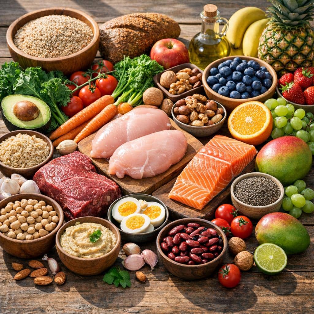 - Proteine: Muskelaufbau und Reparatur durch Fleisch, Fisch, Hülsenfrüchte